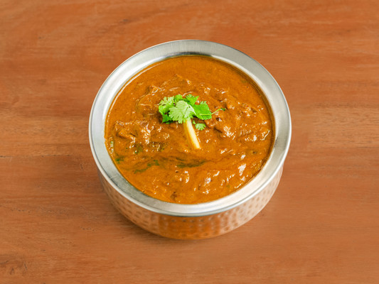 kawałki dla mięso lub ser indyjski omaszczone pastą ze szpinaku, mięty, kolendry i przypraw orientalnych w sosie curry Mięso - 100 g, ser 100 g, dorsz- 100g, krewetki- 6 szt. Dania- 350 g
