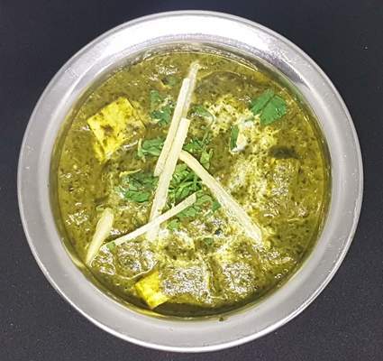 Kawałki wybranego mięsa podduszone w sosie szpinakowym z dodatkiem cebuli, imbiru, czosnku oraz pomidorów, doprawione indyjskimi przyprawami podawane z odrobiną świeżej śmietany. Mięso - 100 g, ser 100 g, dorsz- 100g, krewetki- 6 szt. Dania- 350 g.