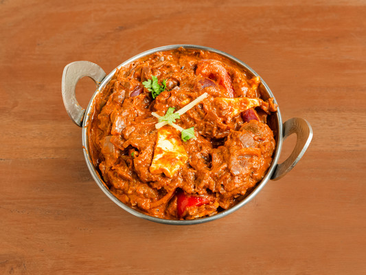 (Ostry) kawałki wybranego mięsa, papryki, pomidorów, cebuli, ugotowane w maślano-pomidorowym sosie z dodatkiem przypraw indyjskich oraz kolendry. Mięso - 100 g, ser 100 g, dorsz- 100g, krewetki- 6 szt. Dania- 350 g