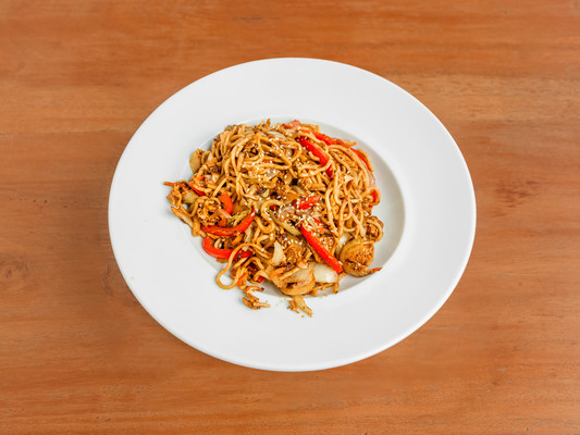cieniutki makaron smażony z cebulą, kurczakiem, jajkiem, czosnkiem i warzywami. 400g